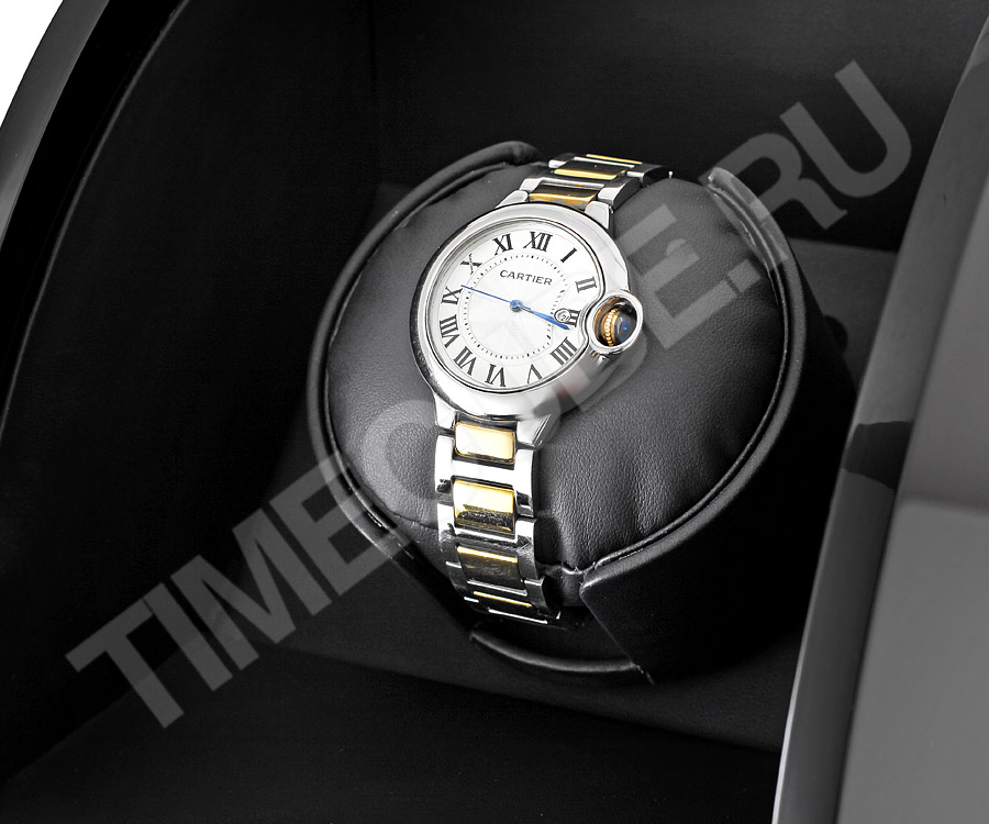 Искусственная кожа черного цвета в тон корпусу покрывает внутреннюю часть изделия. Крышка сделана из органического стекла и имеет ручку для удобного открывания бокса для часов с автоподзаводом.