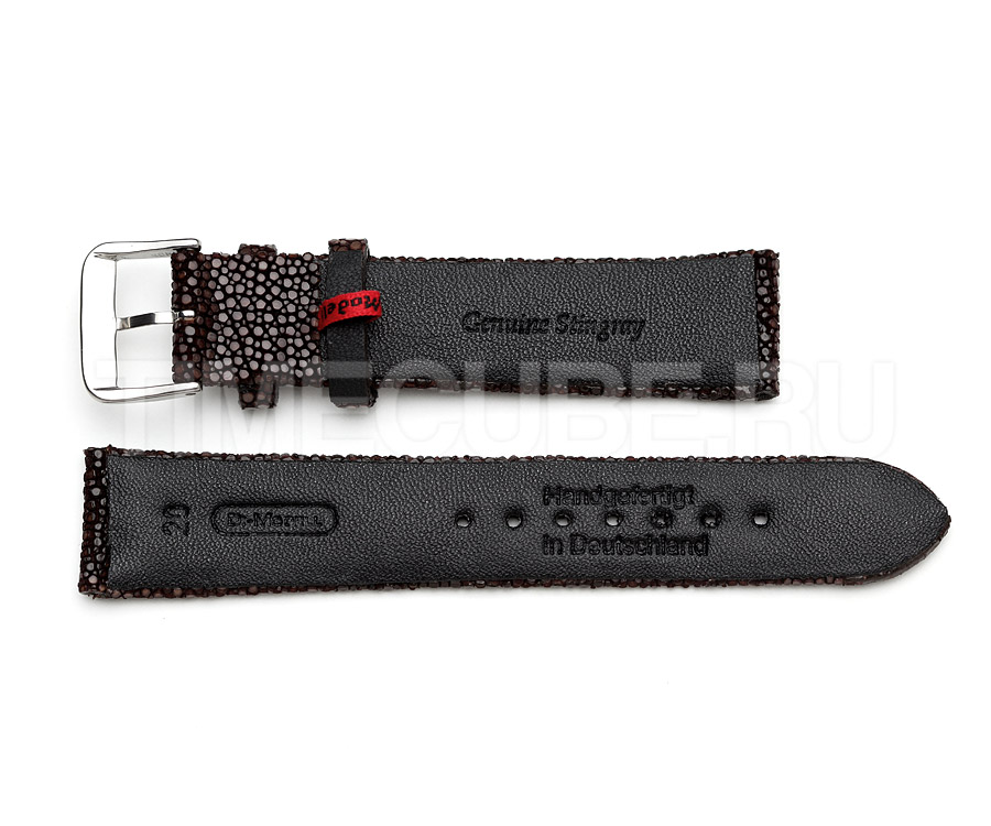 Ремень для мужских часов. Материал: натуральная кожа ската. Цвет: темно-коричневый, глянцевый. Ремешок имеет утолщение к корпусу часов от 18 до 20 мм. С фиксатором петли. Цвет металла застежки: серебро. Внутренняя поверхность из гладкой кожи теленка. Производитель: "Di-Modell". Ручная сборка в Германии.