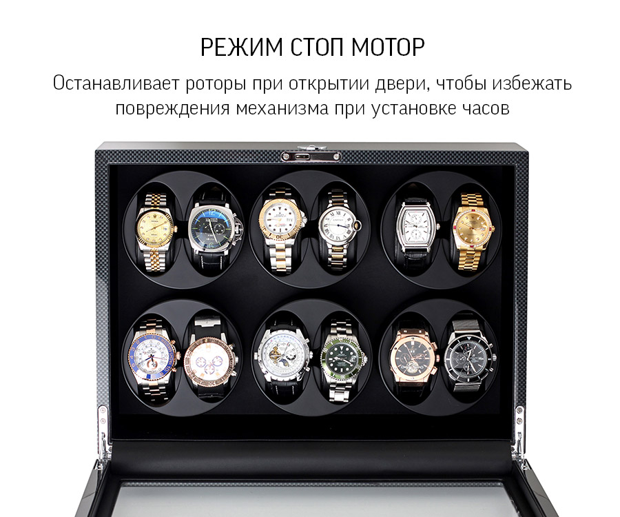 • АВТОСТОП: При открытии крышки моторы перестают вращаться. Часы удобно вынимать и устанавливать. Функция также предотвращает поломку механизма виндера.