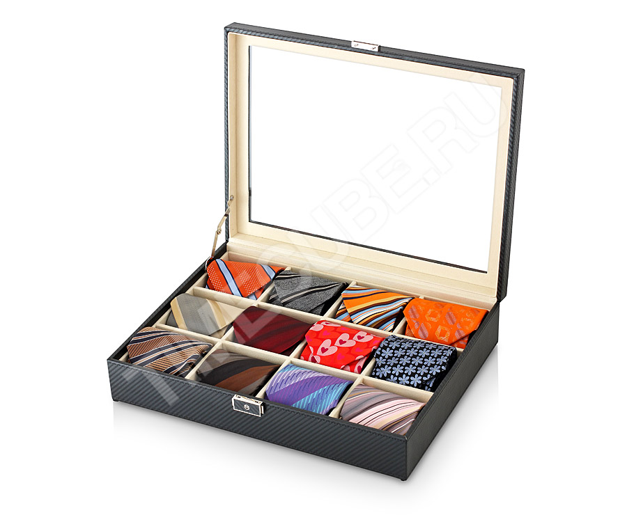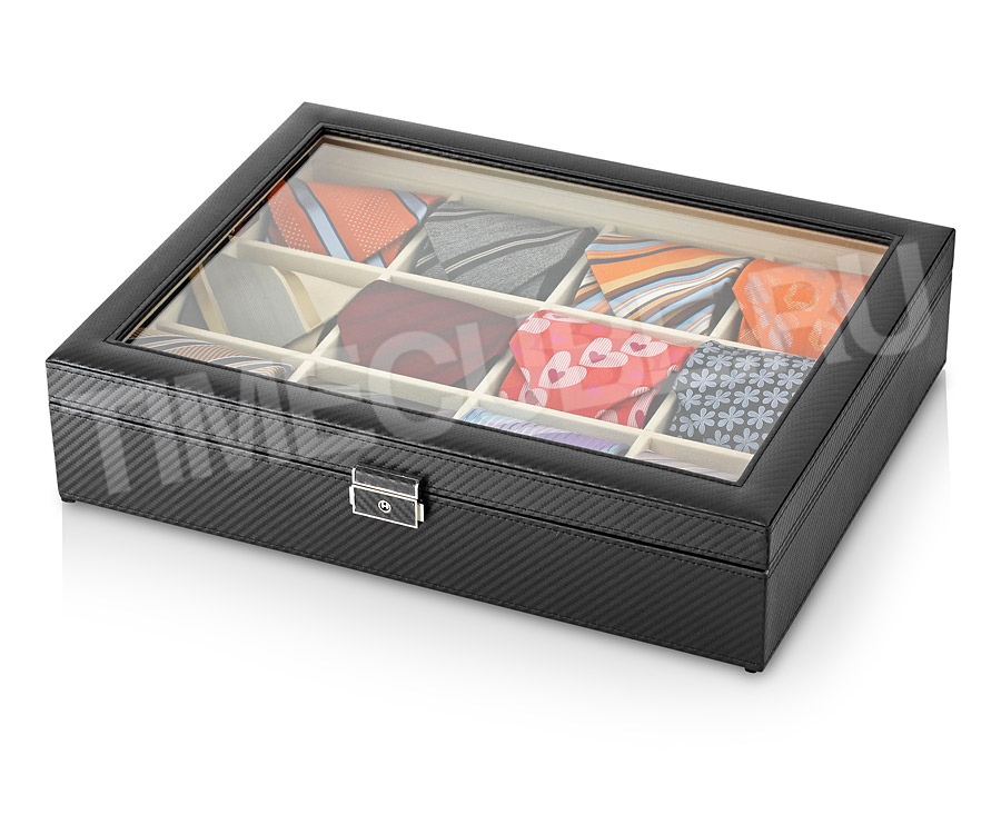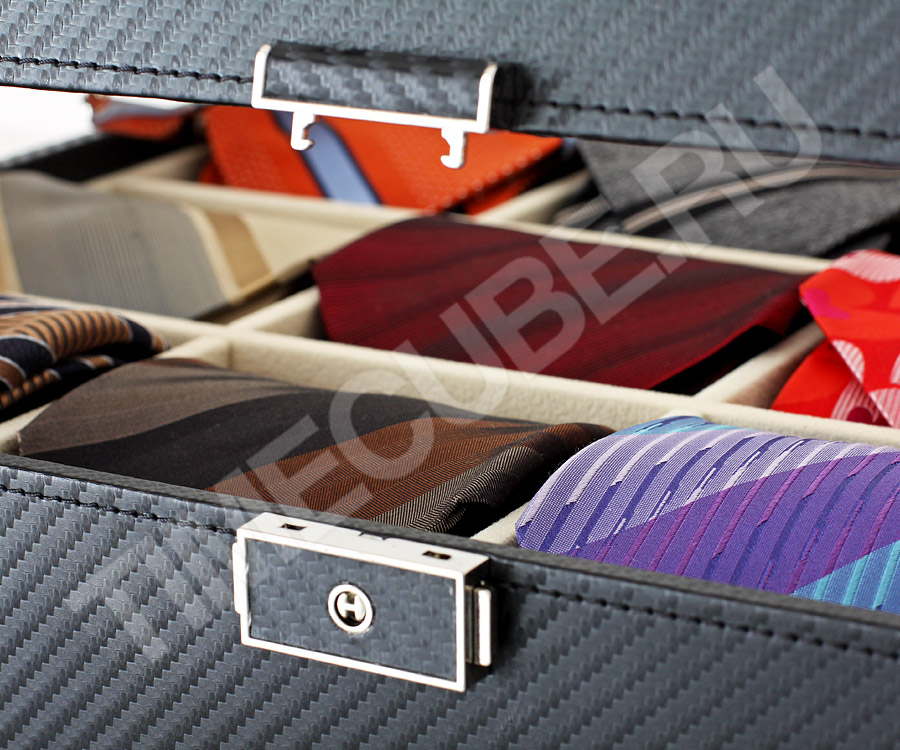Шкатулка для галстуков сделана из деревянного каркаса и обшита сверху карбоновой пленкой черного цвета. Внутри шкатулка обшита мягким бархатом бежевого цвета. В крышку вставлено панорамное органическое стекло. Закрывается на замочек.