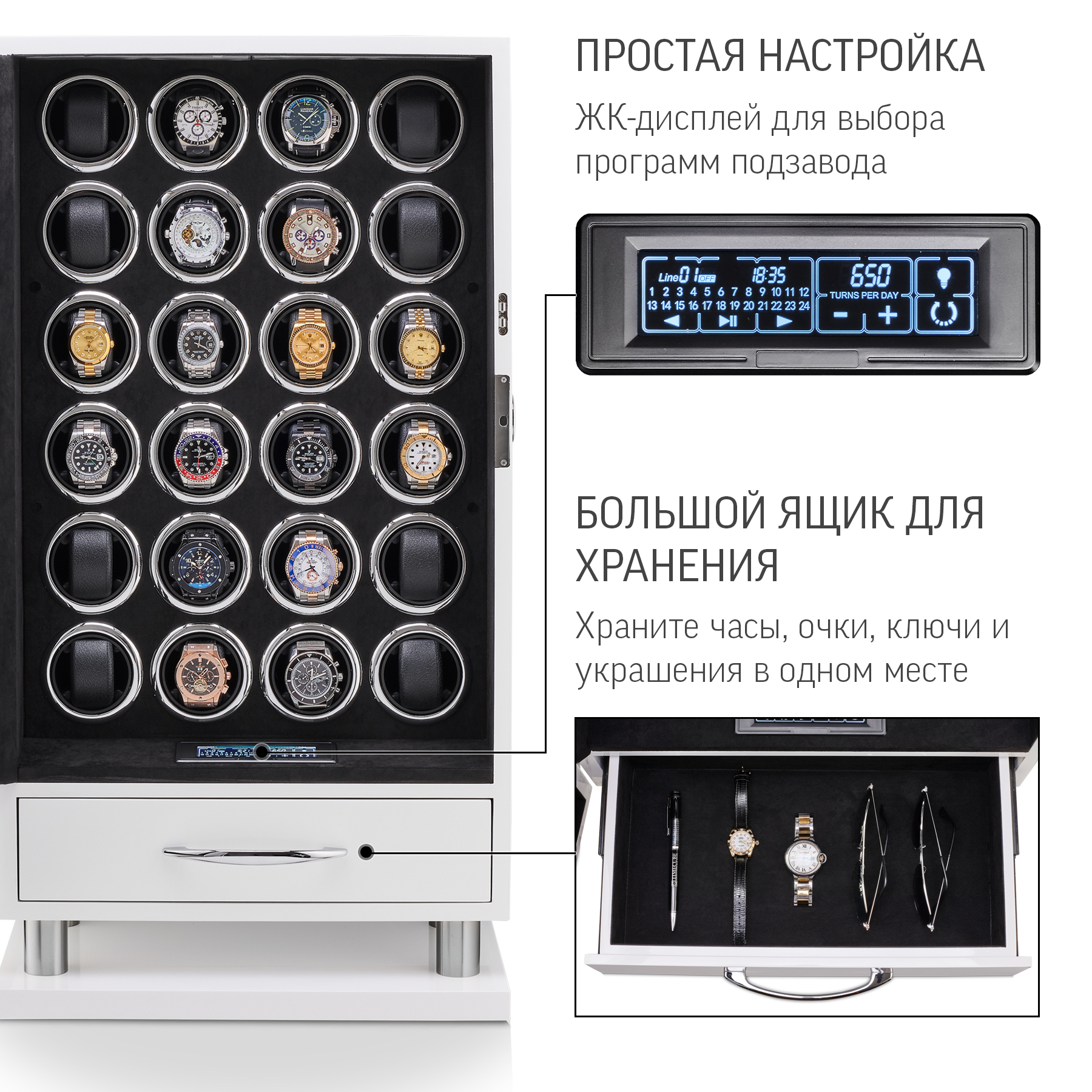 Шкатулка с автоподзаводом для часов 8024-WF-D Для подзавода двадцати четырех часов. Материал корпуса: дерево. Внешняя отделка: лак. Внутренняя отделка: бархат. Полиуретановая подушка. Максимальный диаметр часов: 6,0 см. Дополнительные опции: - USB-разъем; - дисплей (TouchScreen); - подсветка; - стоп мотор. Размер прибора: 27х44х82 см. Размер упаковки: 42х59х98 см. Масса нетто: 25,8 кг. Масса брутто: 47,2 кг. PT3M58S 2025-12-01T08:10:58+03:00
