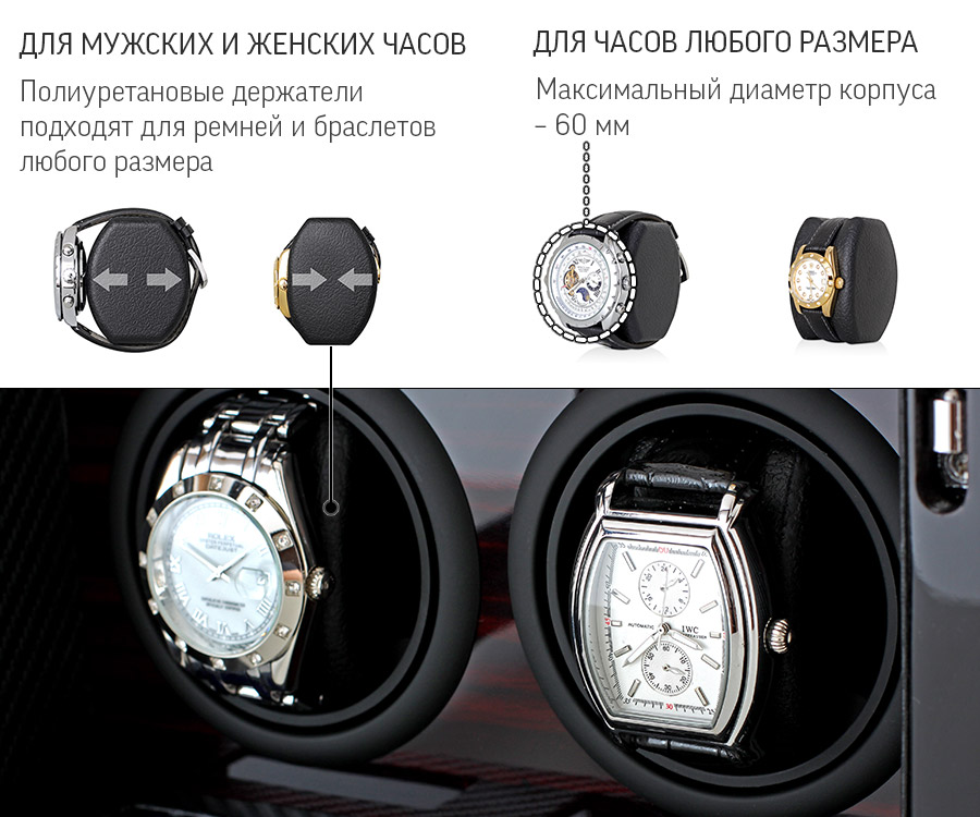 • ДЛЯ МУЖСКИХ И ЖЕНСКИХ ЧАСОВ: Универсальные держатели подходят для часов с ремешками или браслетами любой длины. Максимальный диаметр часов - 65 мм.