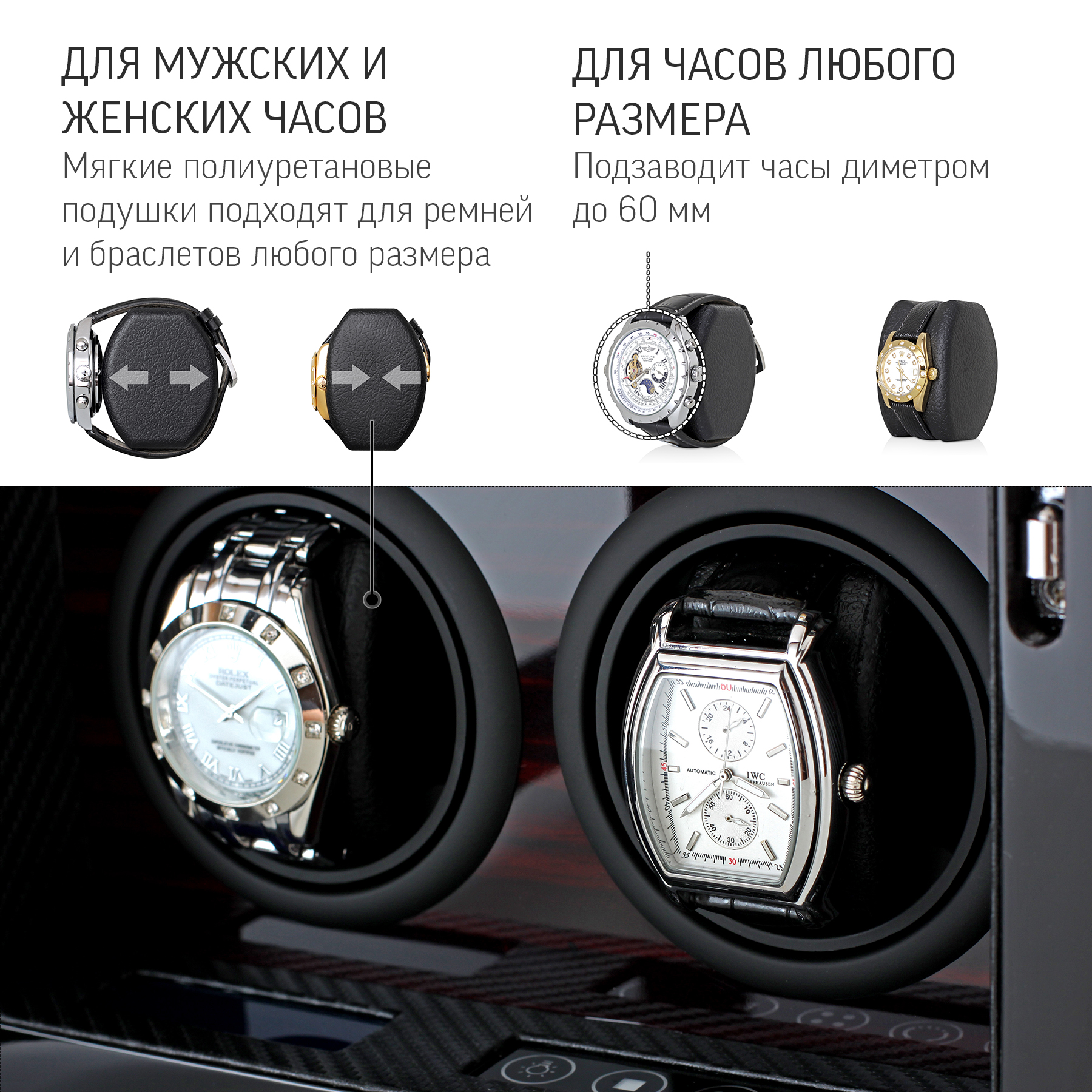 • ДЛЯ МУЖСКИХ И ЖЕНСКИХ ЧАСОВ: Износостойкие полиуретановые держатели подходят для часов с ремешками или браслетами любой длины. Максимальный диаметр часов - 70 мм.