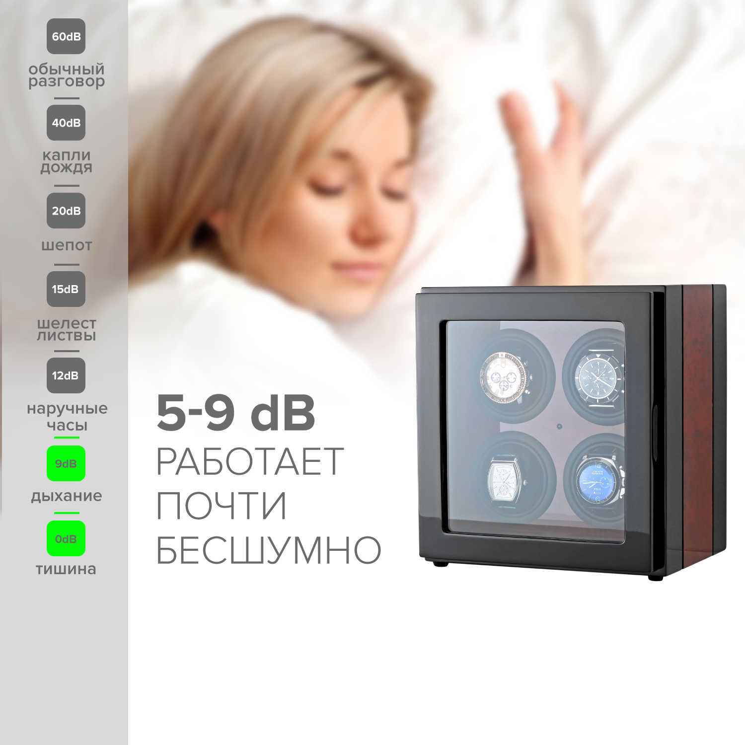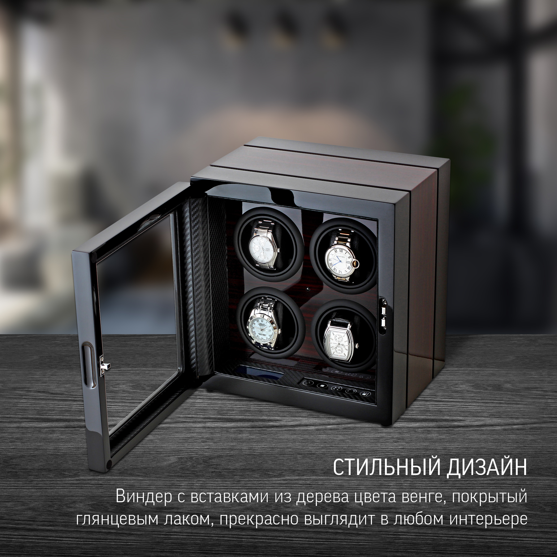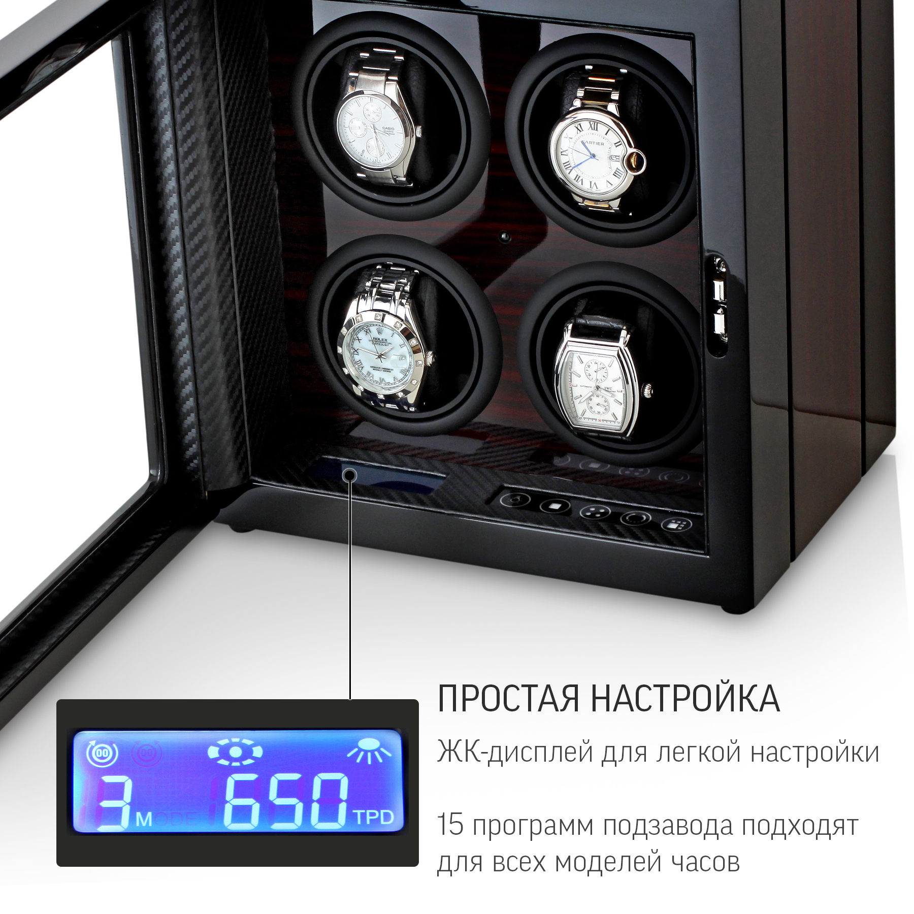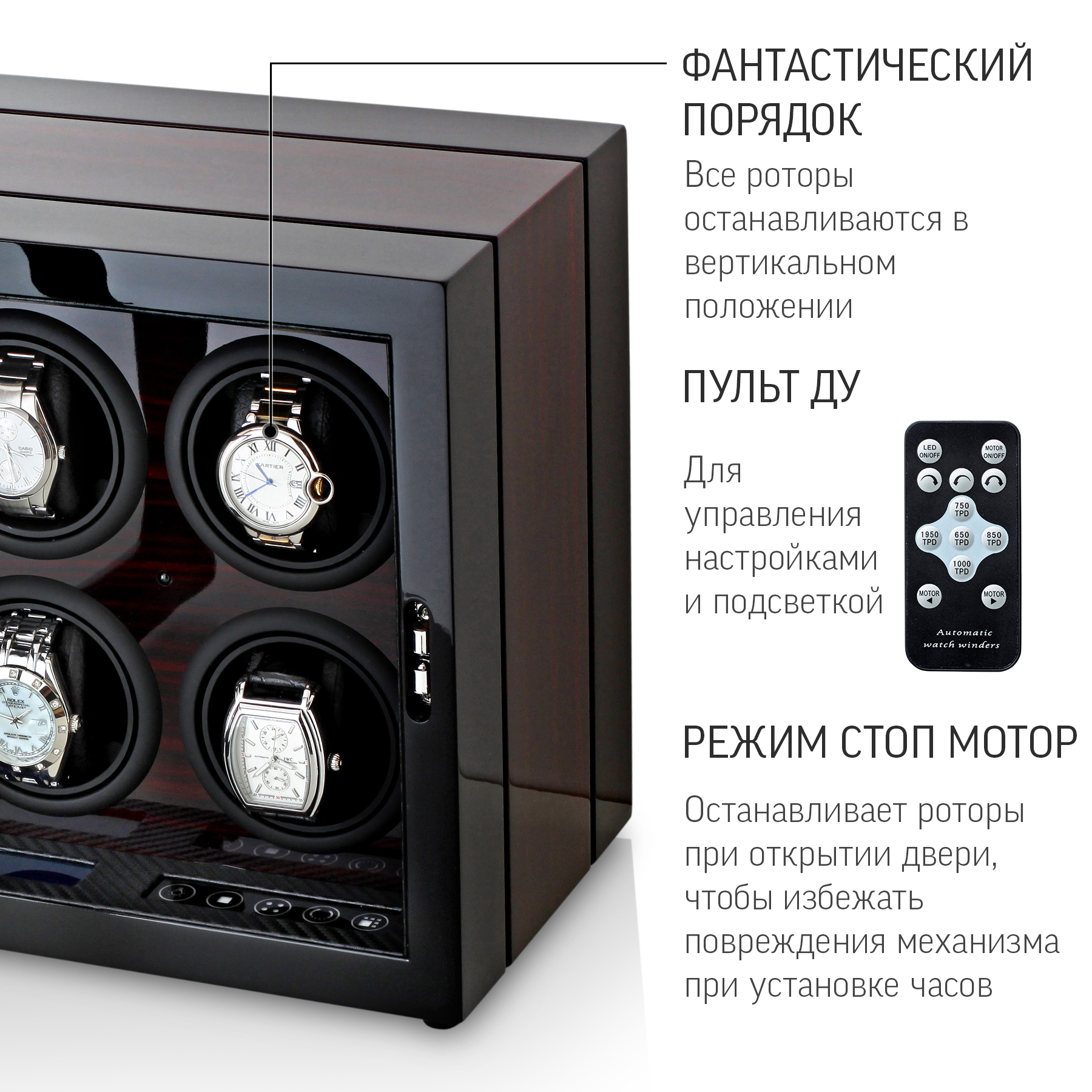 • АВТОСТОП: При открытии дверцы моторы останавливаются. Часы удобно вынимать и устанавливать. Функция также предотвращает поломку механизма виндера.