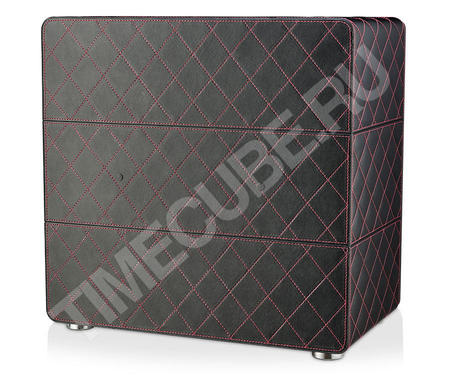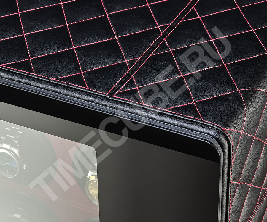 Сейф выполнен из металла и обшит экокожей. Дверь сейфа для часов выполнена из толстого ударопрочного стекла черного цвета. В двери установлен монитор и тач скрин для управления сейфом.