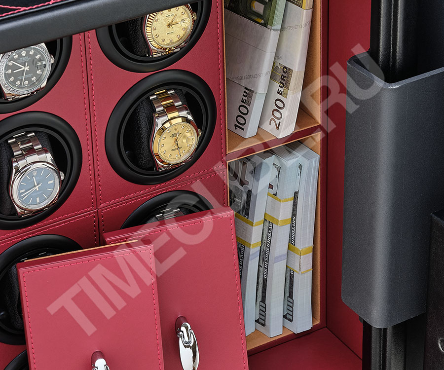 Сейф будет надежно беречь и подзаводить Ваши автоматические часы. Современные функции позволяют удобно пользоваться сложным электронным замком, для открытия которого вы можете использовать либо код, либо магнитную карту. Сейф для часов оснащен сигнализацией с возможностью установки режима чувствительности шок сенсора.